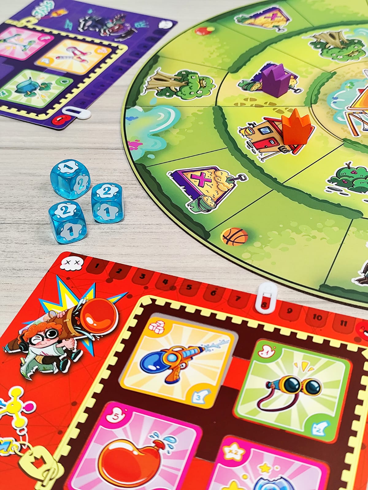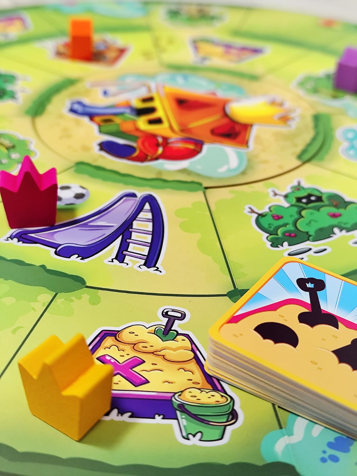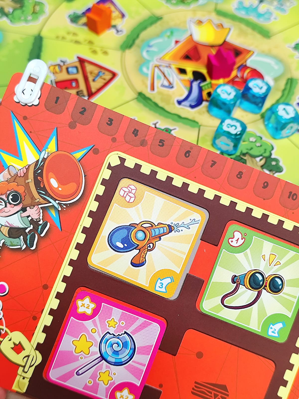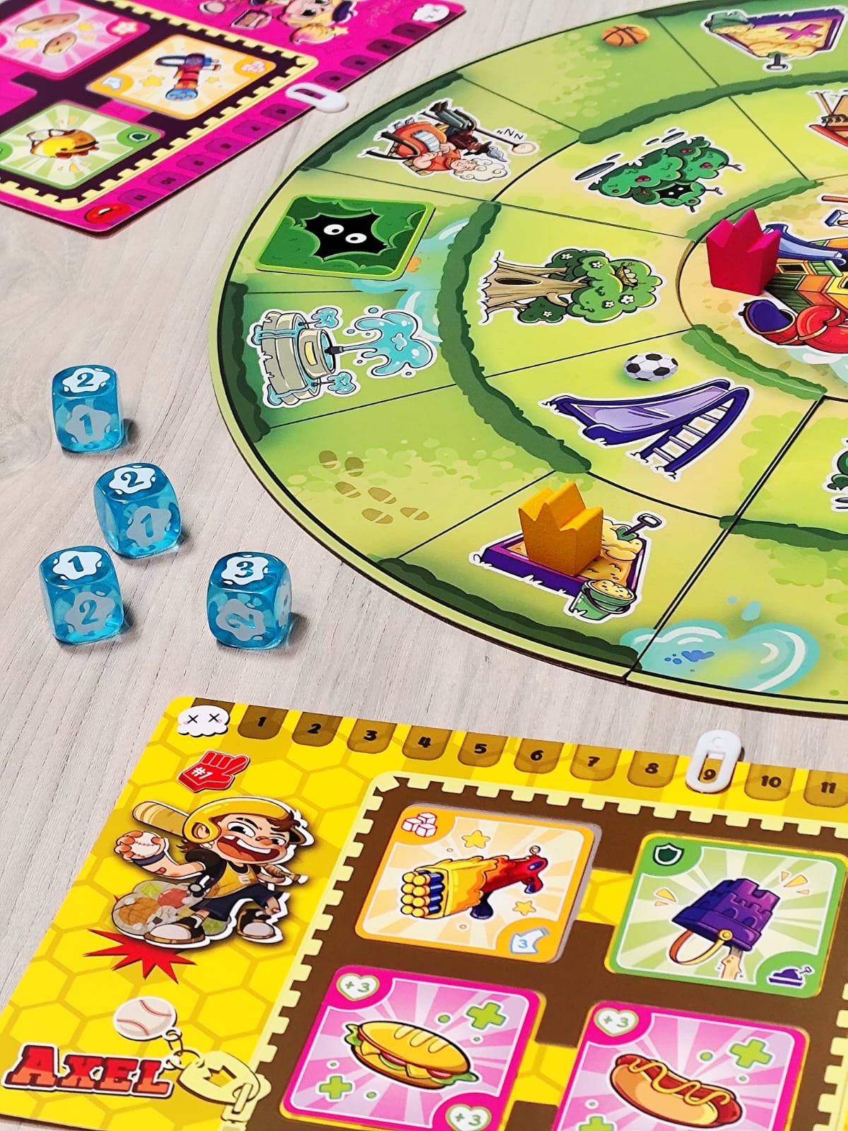 Bienvenido al barrio, donde lo único que importa es llegar al castillo central y demostrar que eres el verdadero rey del parque. Muévete entre columpios, areneros y toboganes mientras recoges armas, armaduras y consumibles. Pistolas de agua, tirachinas, flechas con ventosa… ¡todo sirve para derribar a tus rivales! Cada turno tendrás que moverte, aprovechar la casilla en la que caes y disparar si alguien está a tu alcance. Pero cuidado: el parque está lleno de encuentros inesperados, algunos te darán ventajas… otros te pondrán en serios problemas. Cuando alcances el castillo central tendrás un poder devastador: podrás disparar a todos los jugadores sin límites.