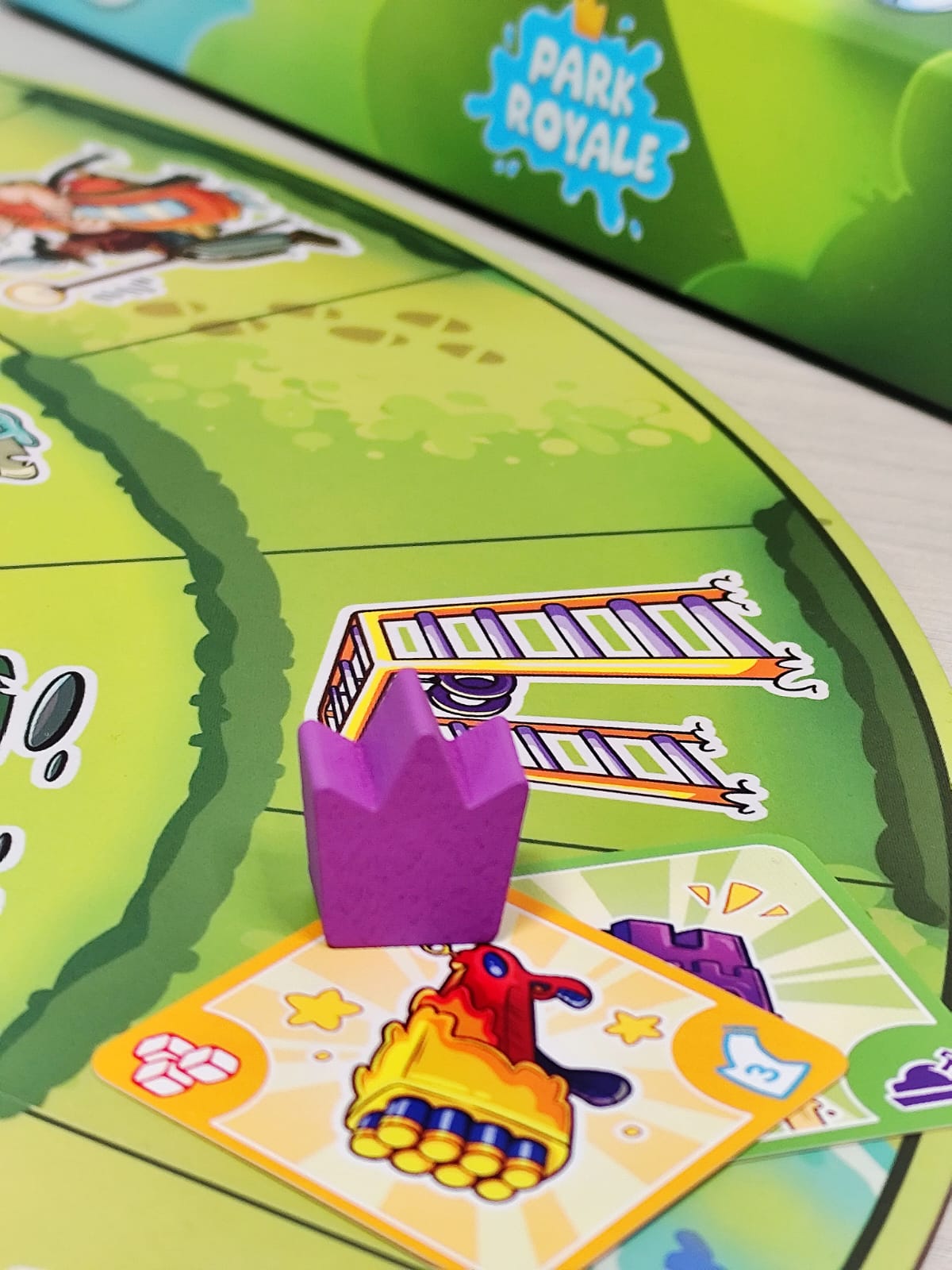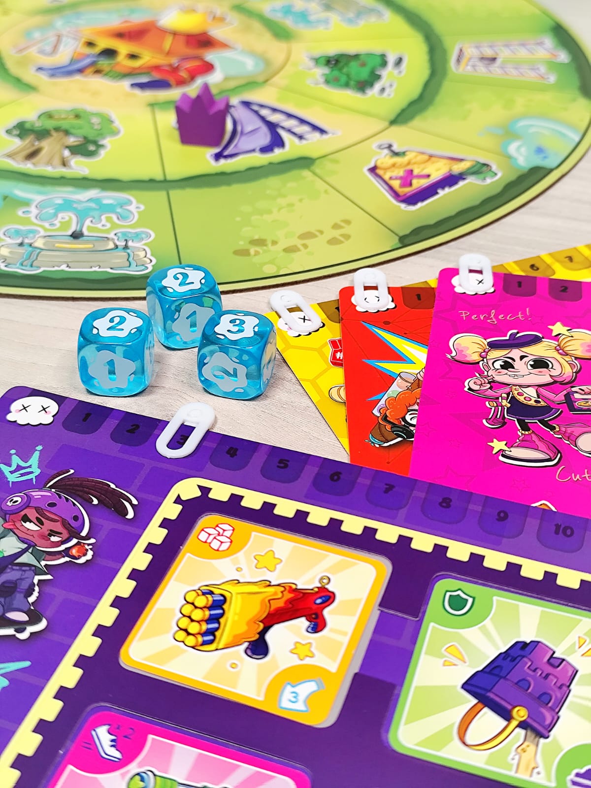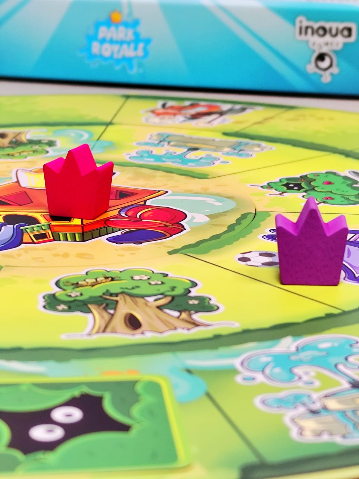 Bienvenido al barrio, donde lo único que importa es llegar al castillo central y demostrar que eres el verdadero rey del parque. Muévete entre columpios, areneros y toboganes mientras recoges armas, armaduras y consumibles. Pistolas de agua, tirachinas, flechas con ventosa… ¡todo sirve para derribar a tus rivales! Cada turno tendrás que moverte, aprovechar la casilla en la que caes y disparar si alguien está a tu alcance. Pero cuidado: el parque está lleno de encuentros inesperados, algunos te darán ventajas… otros te pondrán en serios problemas. Cuando alcances el castillo central tendrás un poder devastador: podrás disparar a todos los jugadores sin límites.
